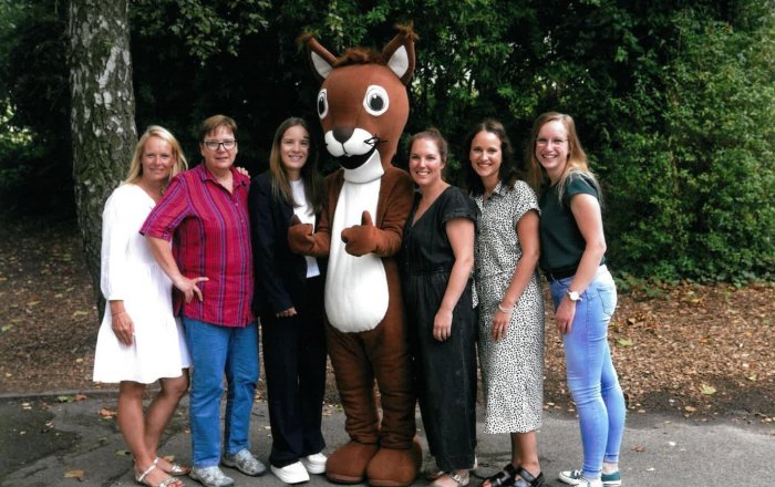Die Klassenlehrerinnen Frau Kurzweg, Frau Carius, Frau Schaser, Frau Saupp, Frau Gläß und Frau Schüle freuen sich zusammen mit Fredi über die neuen Schulanfänger!