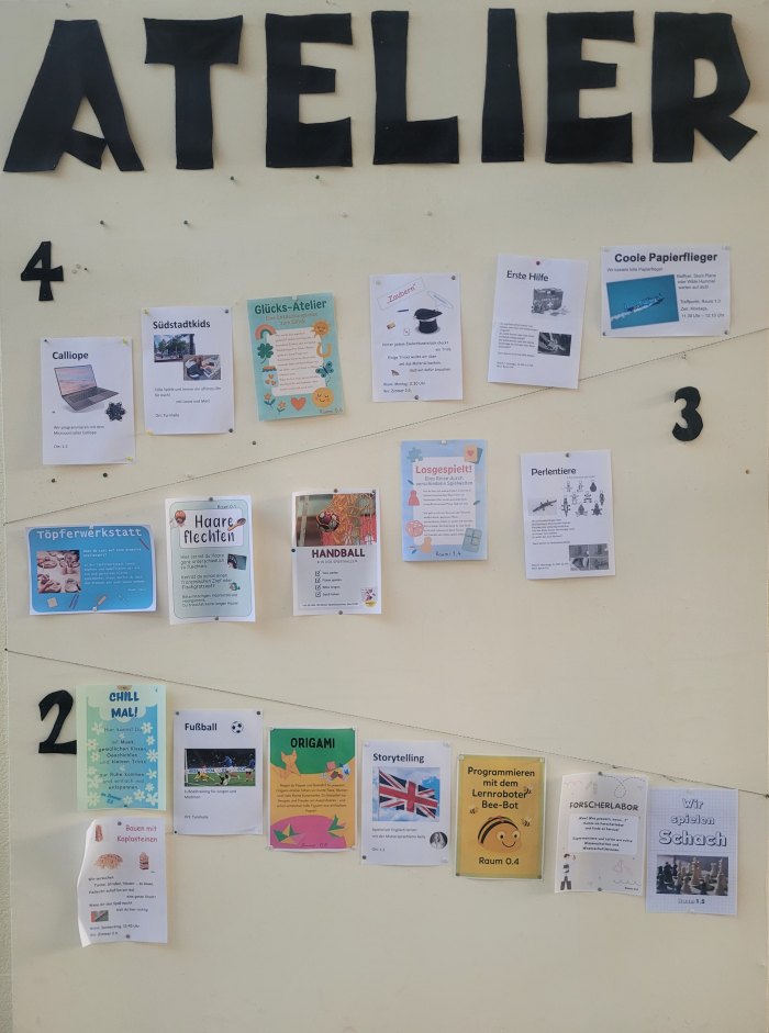 An unserer Atelierwand im Foyer der Silcherschule kannst du dich über die aktuellen Ateliers und deren Inhalte informieren.